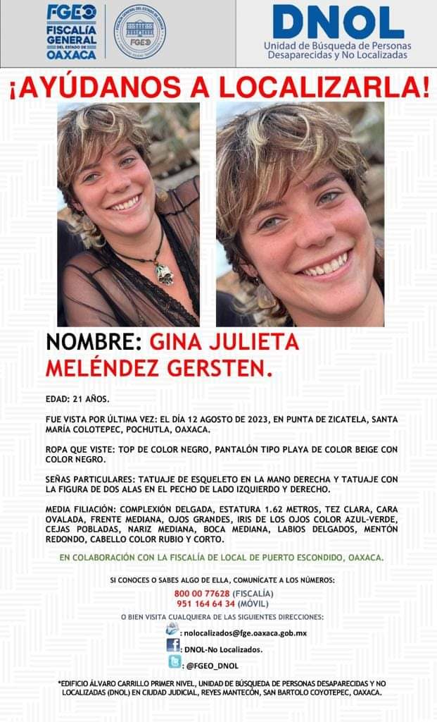 De acuerdo a la ficha al momento de la desaparición Gina quien fue vista por última vez en Punta Zicatela, Santa María Coyotepec, Pochutla vestía top negro, pantalón tipo playa color beige con color negro.
