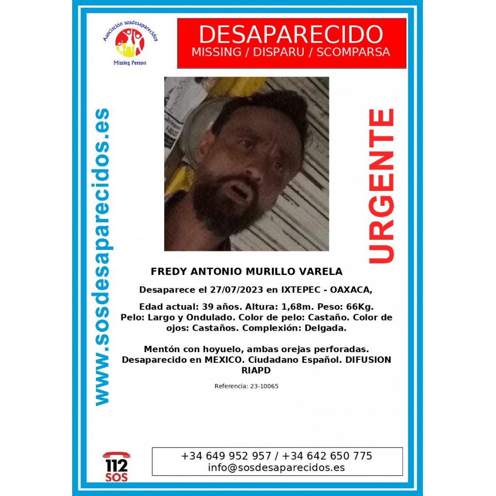 La Asociación de España “sos desaparecidos” emitió una ficha de búsqueda del ciudadano de origen español Fredy Antonio Murillo Varela, desaparecido el 27 de julio de este año, entre Ciudad Ixtepec y la capital de Oaxaca.