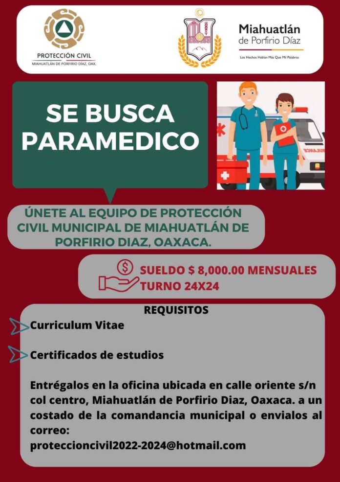 La dirección de Protección Civil Municiipal de Miahualtán emitió este martes una convocatoria para que un paramédico se una a ese equipo de trabajo.