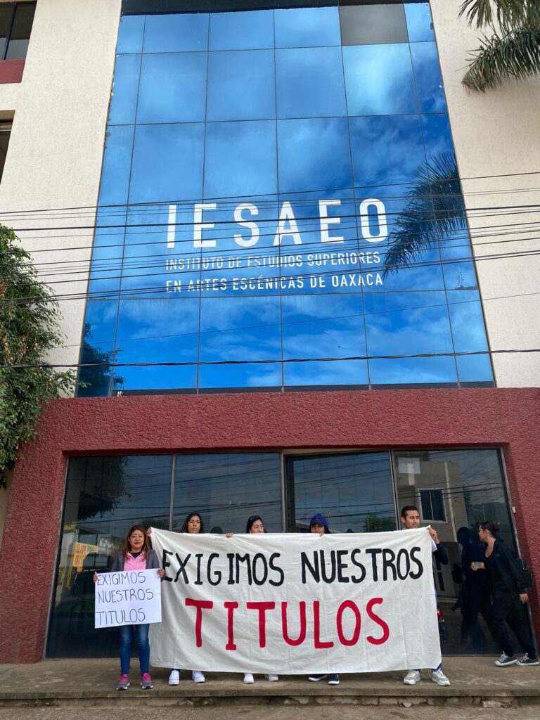 Jóvenes del Instituto de Estudios Superiores en Artes Escénicas de Oaxaca (IESAEO), se manifiestan afuera de su universidad para exigir entrega inmediata del título universitario.