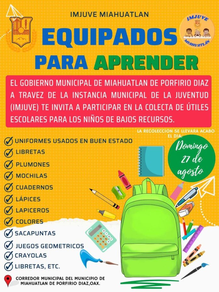 El municipio de Miahuatlán de Porfirio Díaz, que encabeza José Alberto Martínez Luna, a través del Instituto Municipal de la Juventud convoca a la población en la colecta de útiles escolares en beneficio de los niños de escasos recursos.