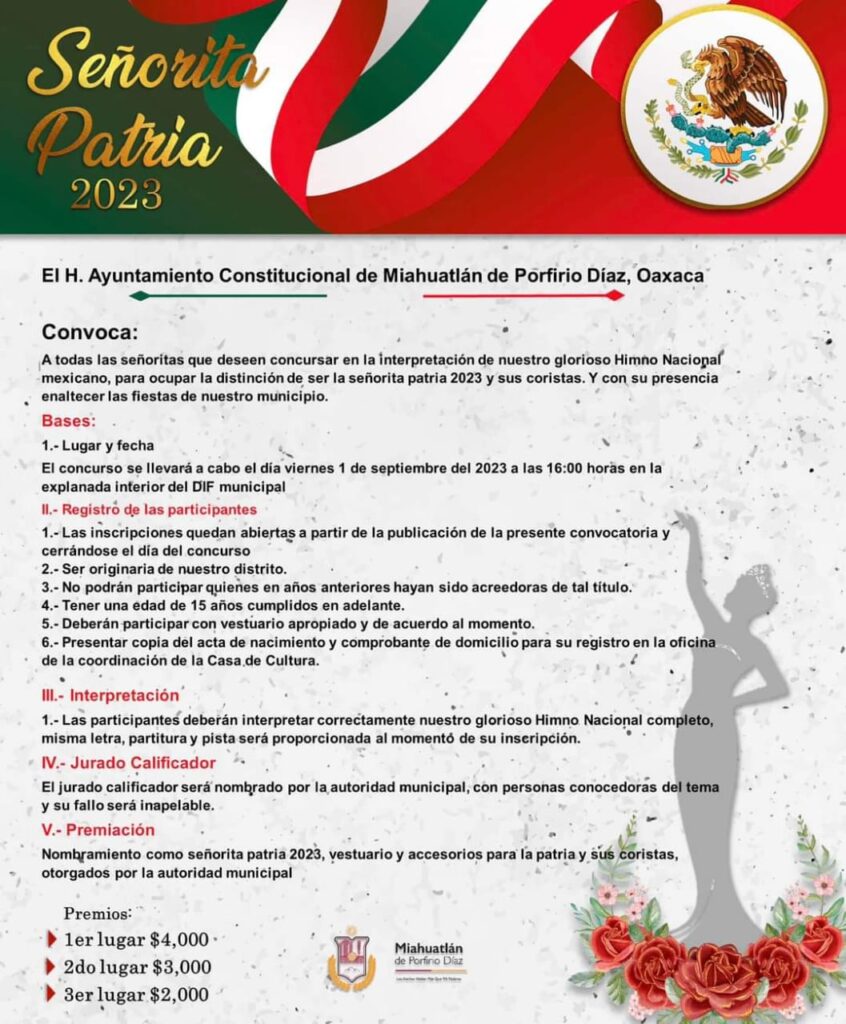 El gobierno que encabeza el presidente municipal de Miahuatlán de Porfirio Díaz, lanzó la convocatoria para que todas las señoritas que deseen puedan participar en el concurso “Señorita Patria”.