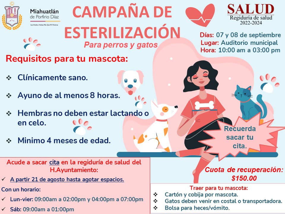 El municipio de Miahuatlán de Porfirio Díaz, a través de la regiduría de salud municipal, llevará a cabo este 7 y 8 de septiembre la campaña de esterilización para mascotas.