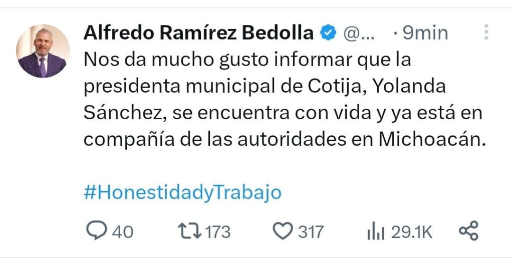 “Nos da mucho gusto informar que la presidenta municipal de Cotija, Yolanda Sánchez, se encuentra con vida y ya está en compañía de las autoridades en Michoacán”, escribió en su cuenta de X, antes Twitter.